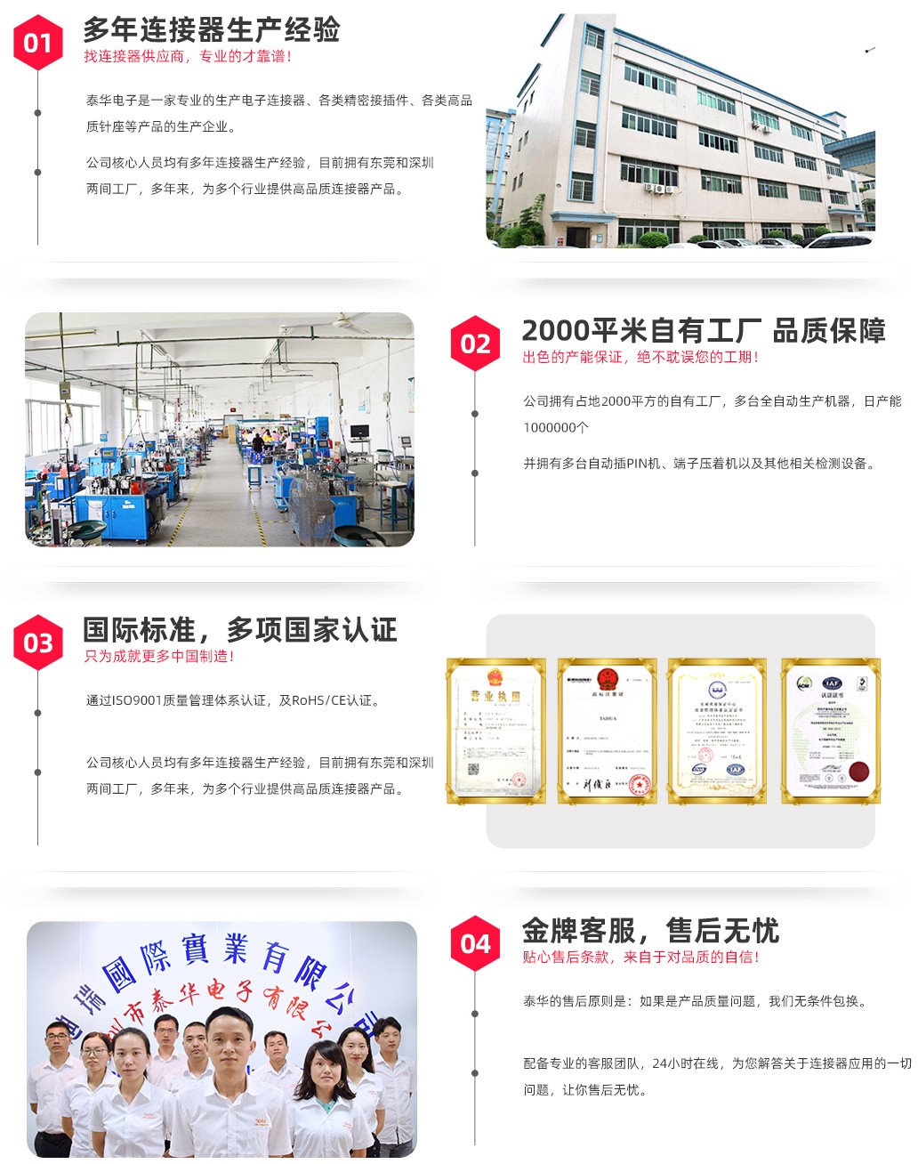 深圳市泰華電子有限公司15年專注連接器,多來成功為全國2000家大中小型企業(yè)提供專業(yè)的技術和服務。本公司具備先進的生產(chǎn)設備,標準化生產(chǎn)流程接插件日產(chǎn)100萬。所有產(chǎn)品通過ISO9001、ROHS等認證,自成立以來一直秉承品質(zhì)為先,客戶至上的理念。